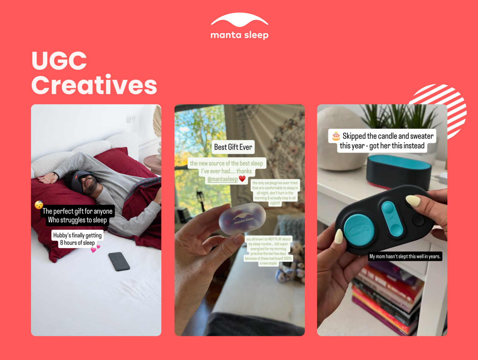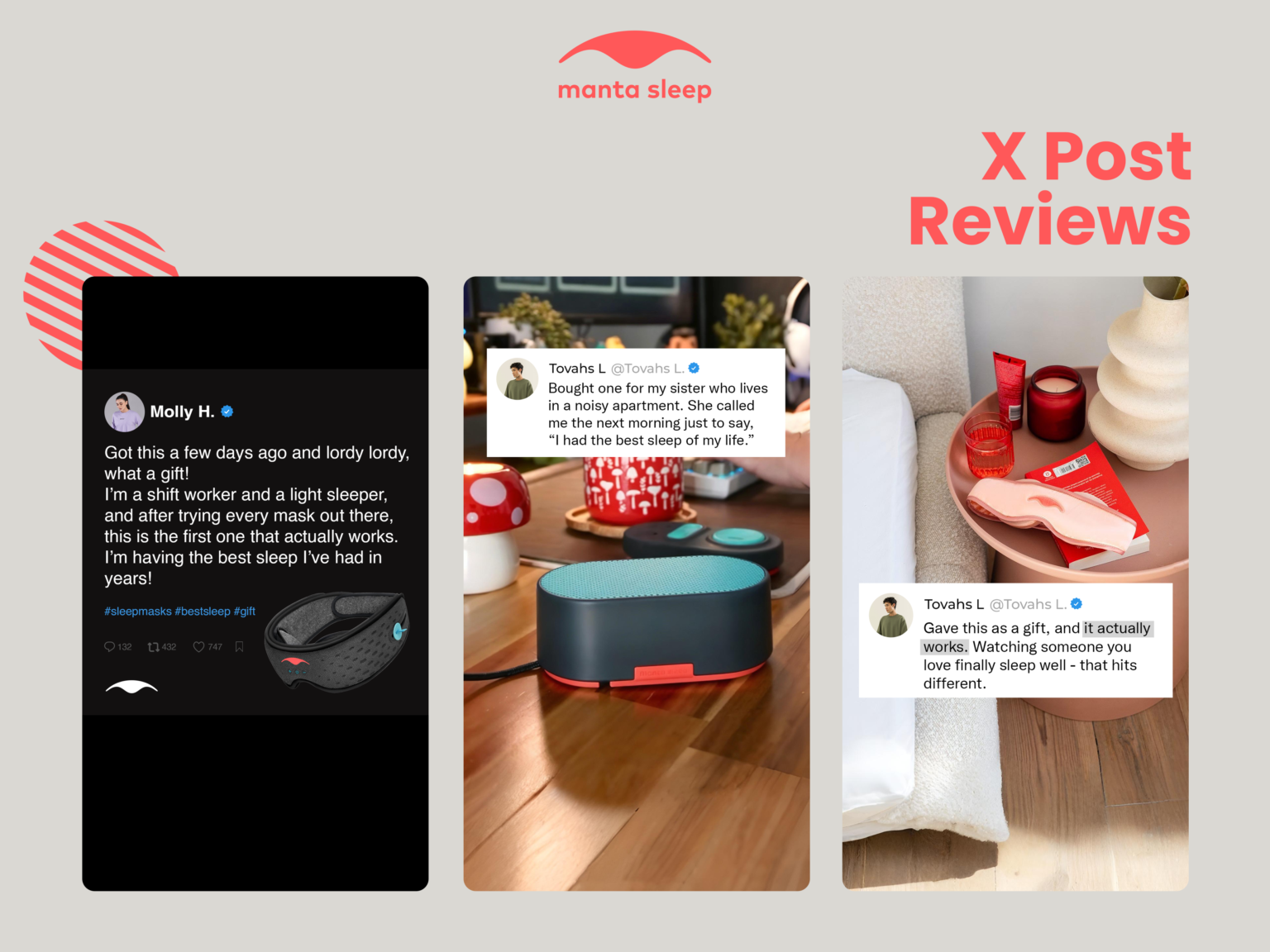 To address this, I created user-generated content in the form of Instagram Stories and X posts that highlighted authentic reviews from real customers who loved the product. I transformed their feedback into engaging, platform-optimized visuals that reinforced trust with real experiences, and also aligned with Manta Sleep’s brand identity.