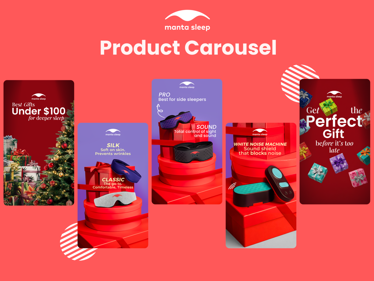 To fix that, I carefully put together colors and theme that would go well with products and brand's aesthetic and made several creatives in 1:1 and 9:16 formats to be used on various platforms. Purple and red theme for the Christmas sale carousel was briefed by them so I used those colors to make visually consistent ad carousel.